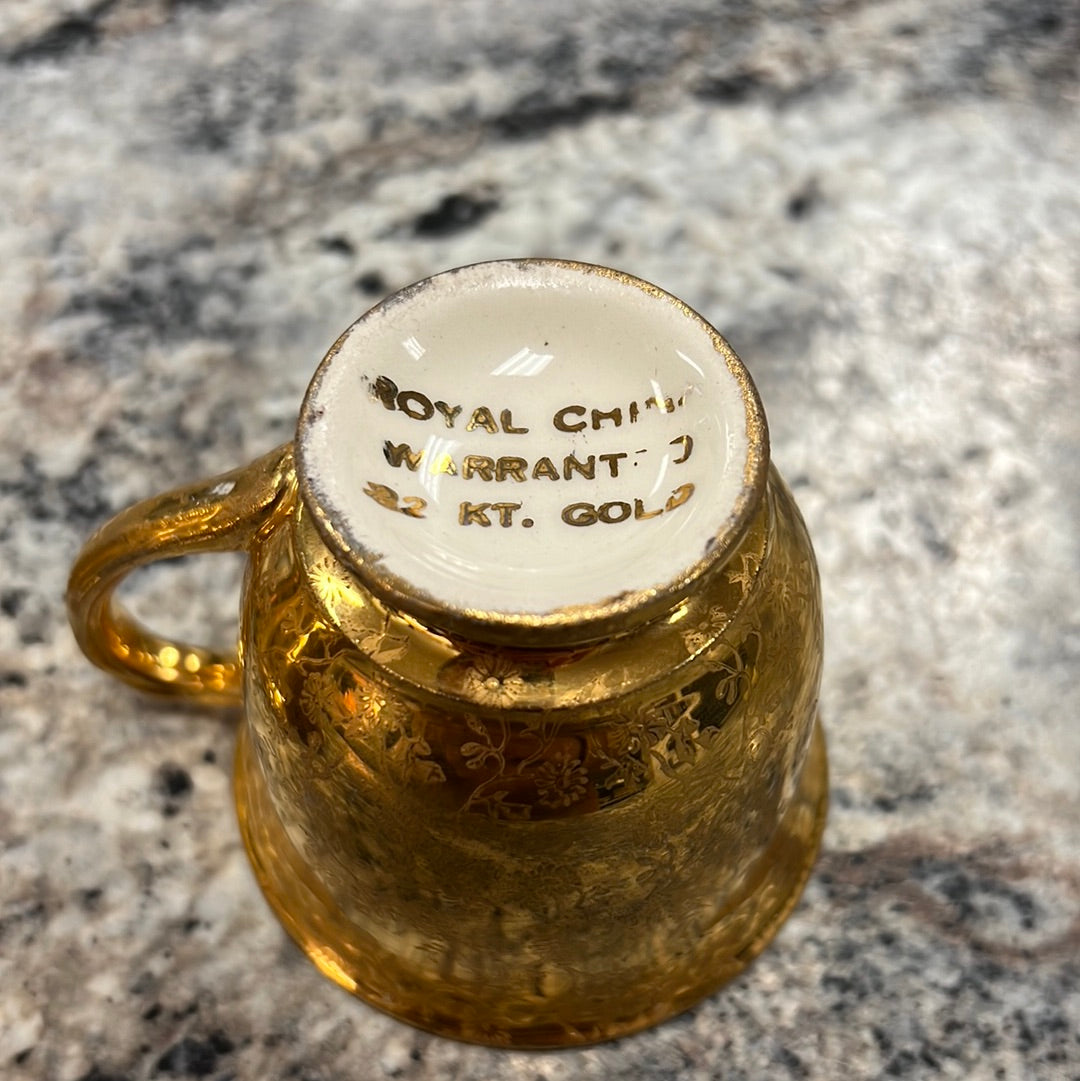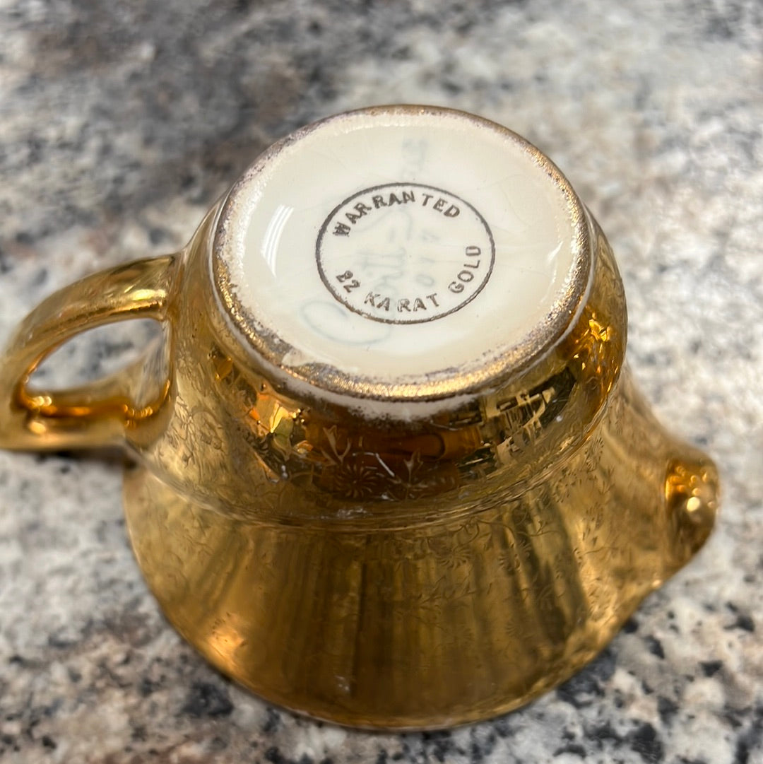 These 22 K Gold Vintage Pieces are in good condition. The gold is rubbing off the edges of each piece from its age. The cup says it’s Royal China. These are sold as a set.