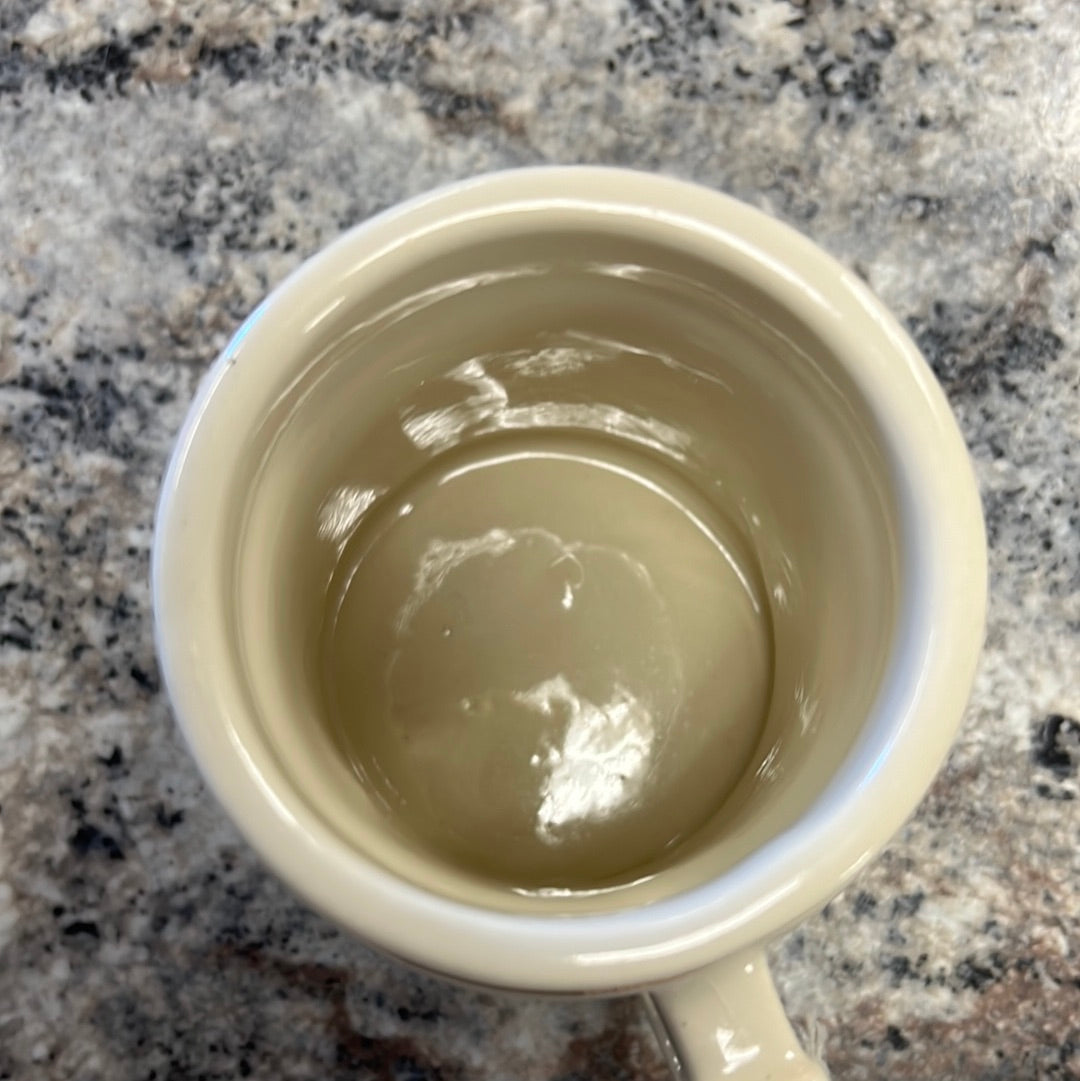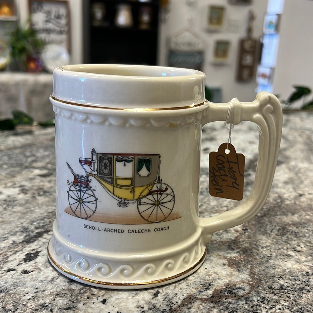 This Ivory Coach Stein is in excellent condition. It has a gold line around the top and bottom of the mug. The handle is really pretty. It has a lot of detail on the whole piece. It measures 4.5 inches tall, and 4 inches wide without counting the handle. The handle is an extra 1.75 inches wide.