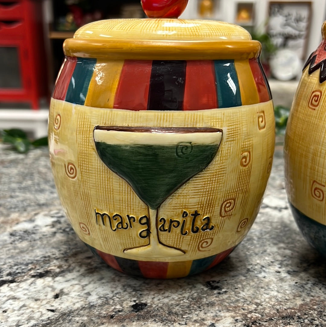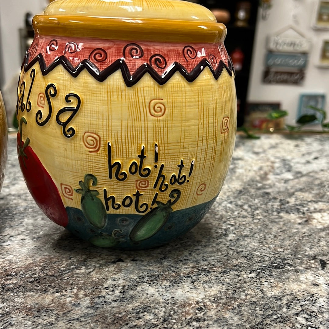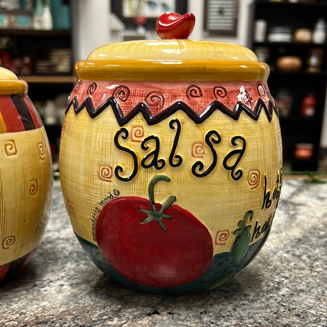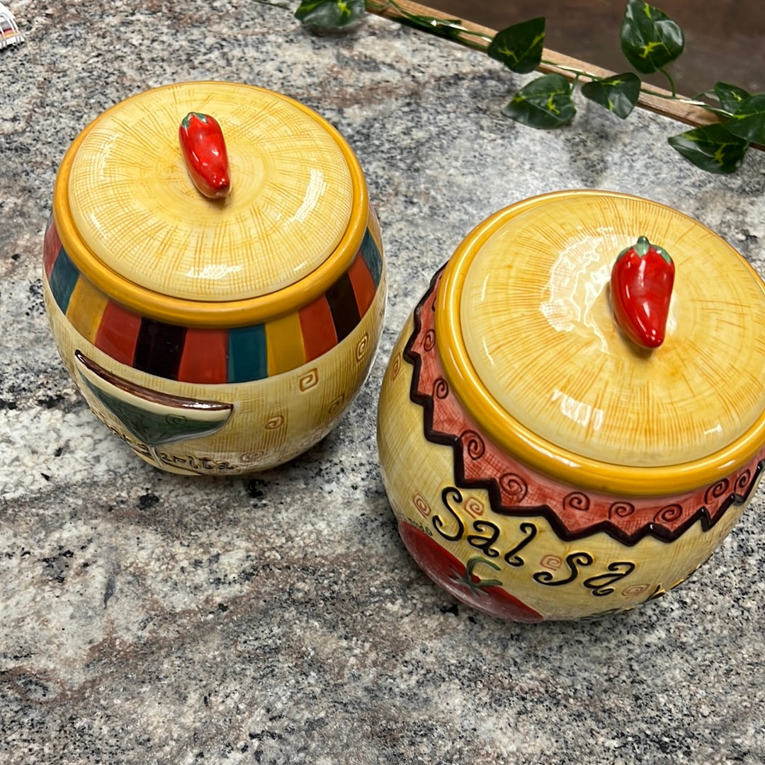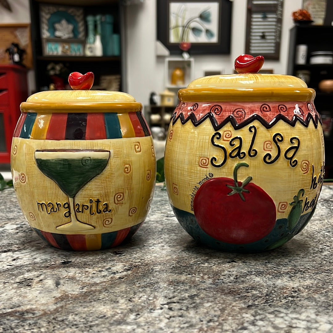This Kitchen Canister Set is in great condition. They are sold as a set. Both come with a lid. They are marked on the bottom. The Salsa Canister measures 7 inches tall, and 5.5 inches wide. The Margarita Canister measures 6.5 inches tall, and 4.5 inches wide.