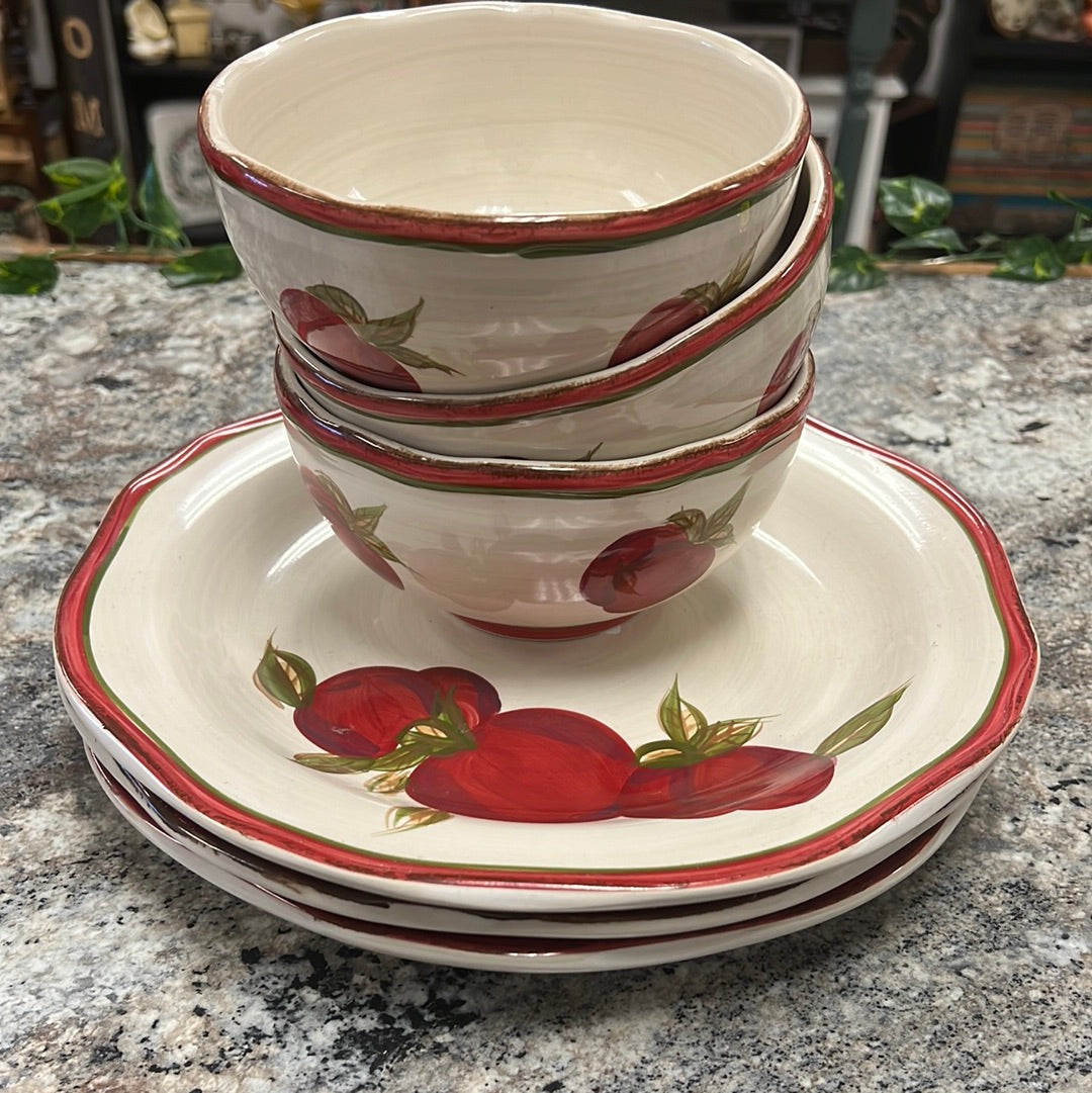 This gorgeous Apple Plates and Bowls Set is in great condition. There’s 3 plates, and 3 bowls in this set. They are all sold together. The plates are 11 inches. The bowls are 6”x3”. This whole set is hand painted. They are all dishwasher and microwave safe. They are made by North Crest Home and stamped on the bottom.
