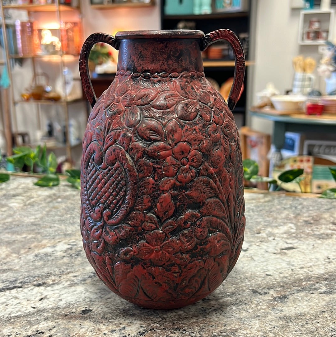This beautiful antique metal container is in great condition. This can also be used as a vase. It measures 8.5”x5”. The top opening is 2.5” wide.