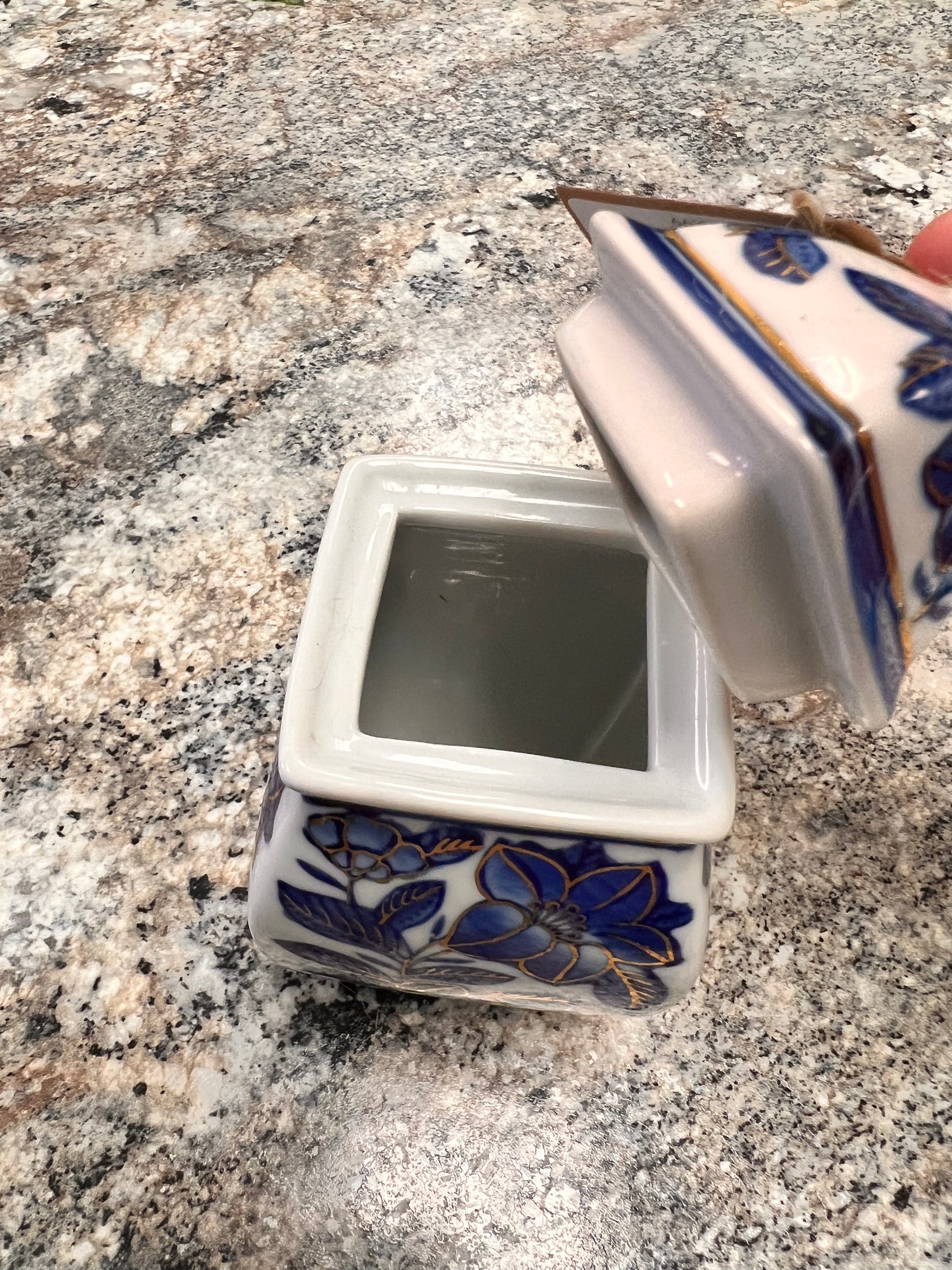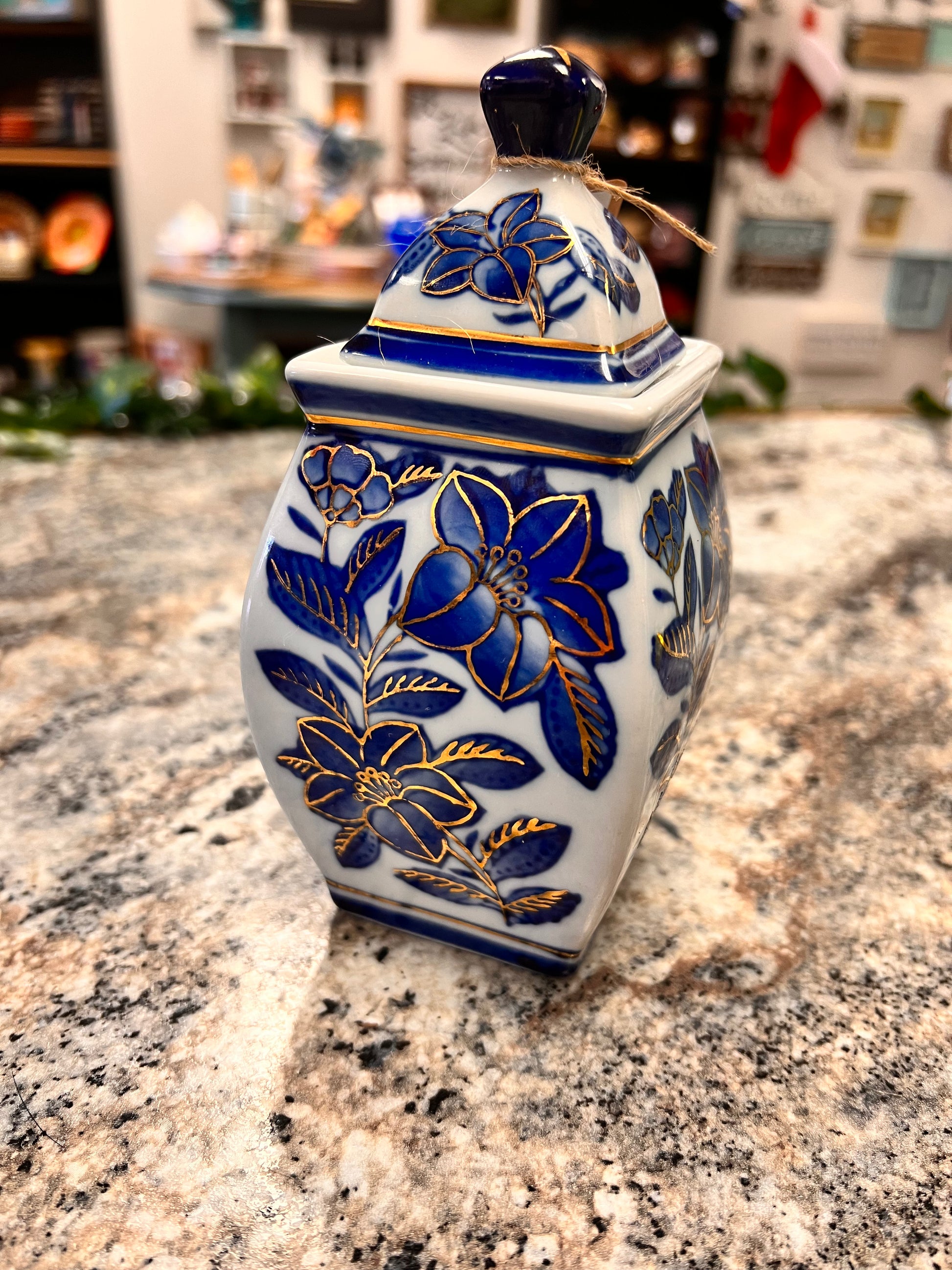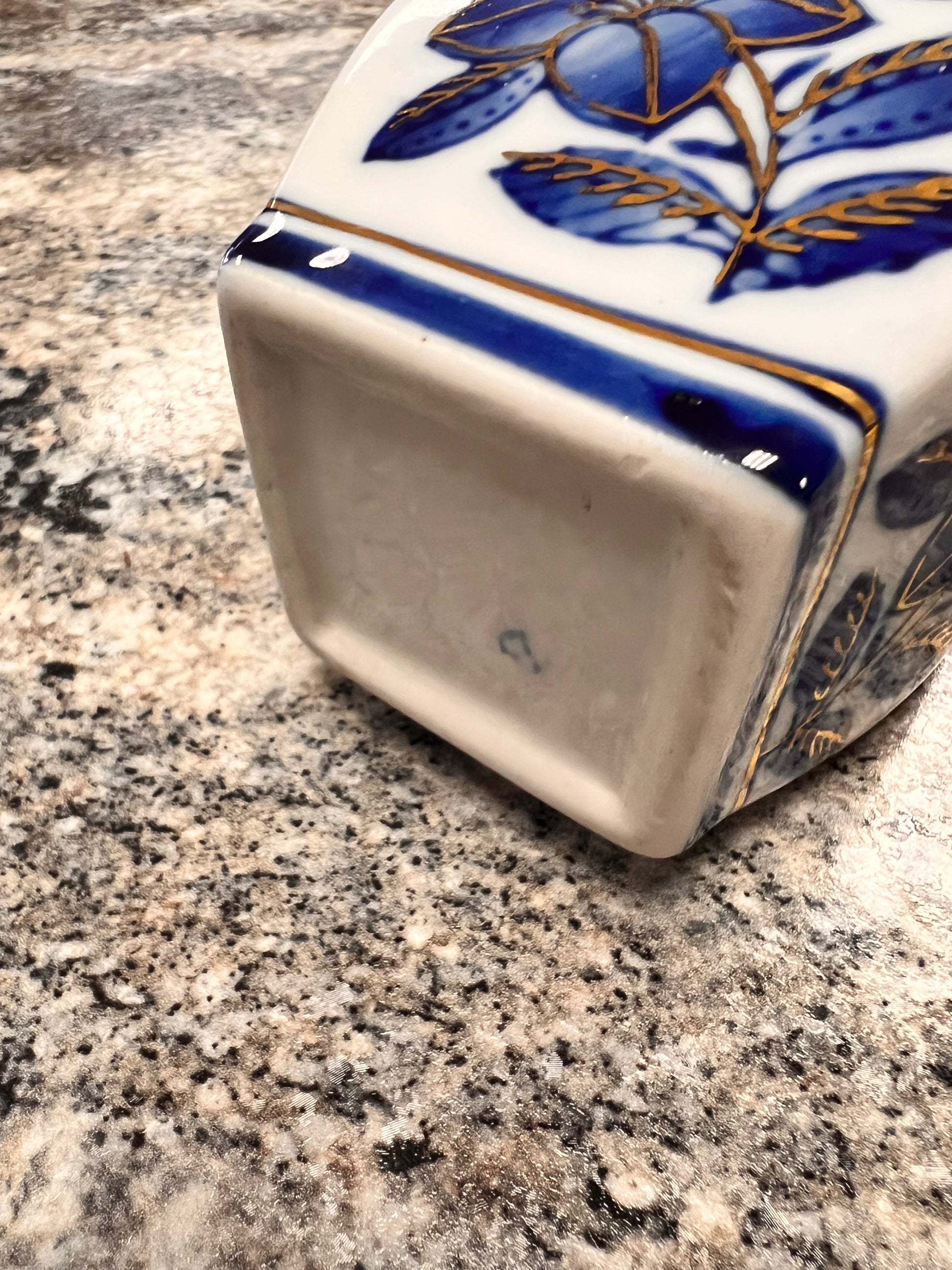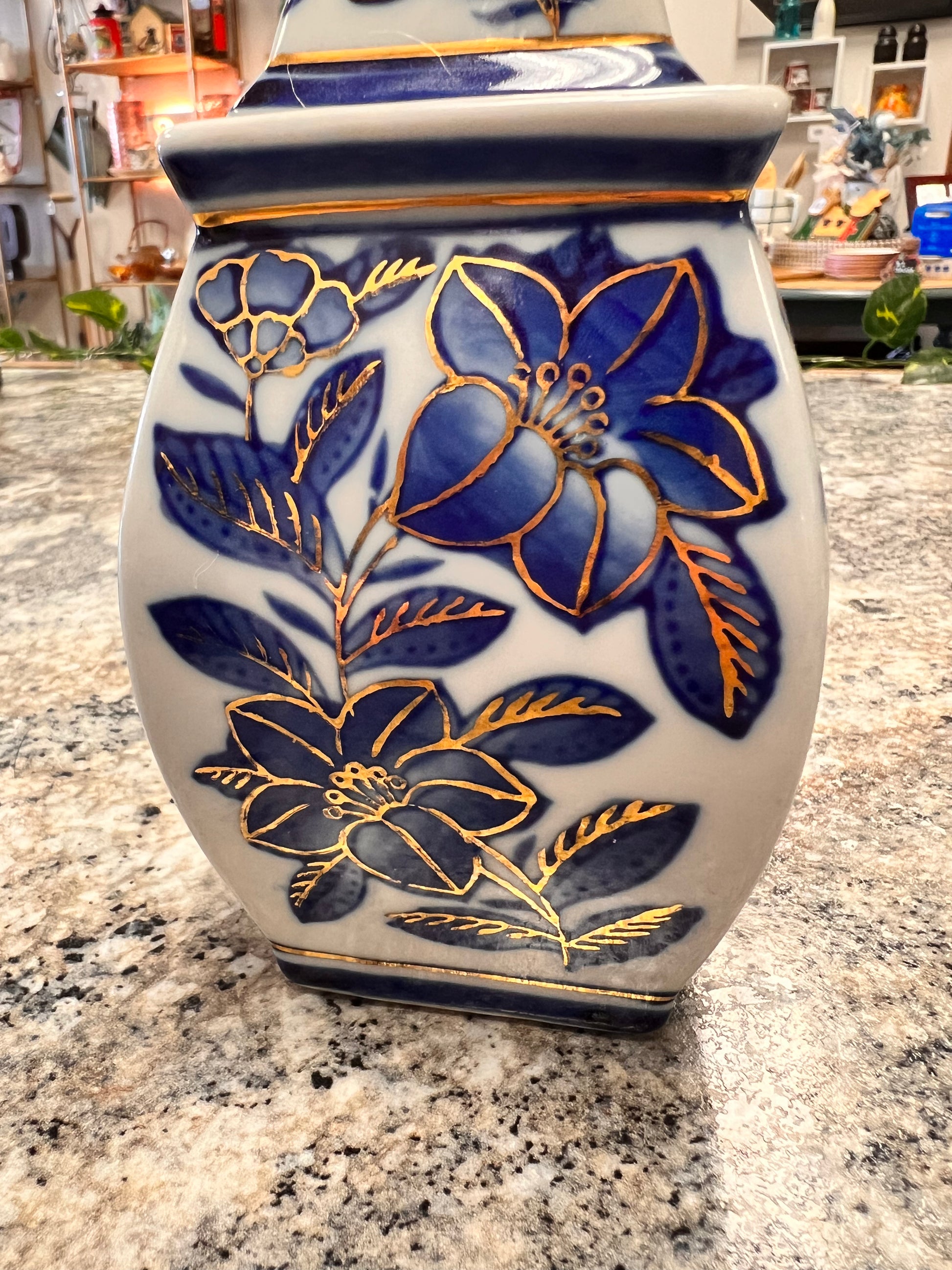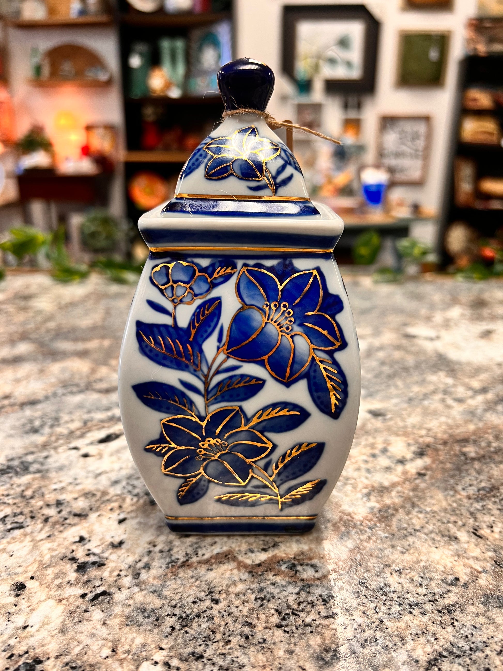 This gorgeous Blue and White Vintage Ginger Jar is in excellent condition. It has a lid that’s also in excellent condition. There’s no cracks or chips. It has a really pretty gold trim around the jar and around all the flowers. It’s such a unique piece to add to your Blue and White Collection. This jar measures 6.5 inches tall, and 3 inches wide.